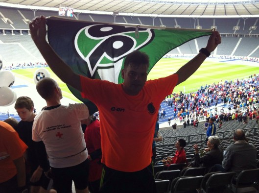 Hier startete nämlich der 6 km lange Frühstückslauf. Den wollten wir uns nicht nehmen lassen. Hier traf ich noch auf Jörn Vorwahl (Hannover 96) und seine Freundin Kerstin. Im Läuferpulk verloren wir uns jedoch schnell wieder. Mit recht langsamen Tempo, dafür viel guter Laune liefen die Teilnehmer ins Olympiastadion. Das war schon ein tolles Gefühl. Wir liefen als einige der Ersten die Ehrenrunde über die Tartanbahn. Dabei konnte man sich selber auf der Anzeigetafel sehen.