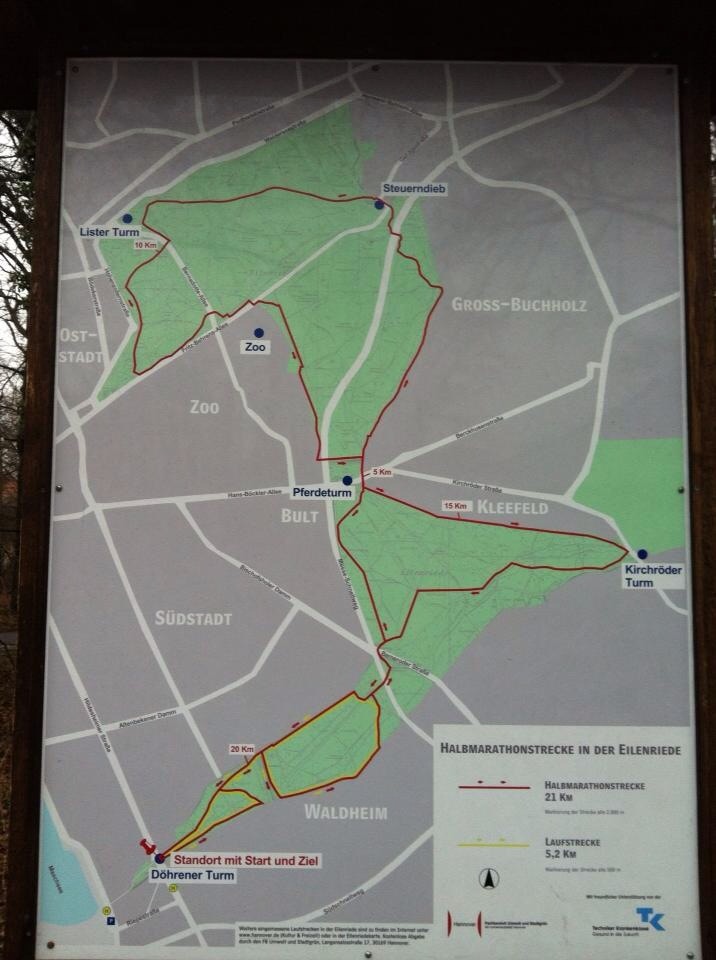 Der Start war unweit des Döhrener Turms. Die Strecke führte uns über zwei große und eine kleine Extrarunde durch die Eilenriede. Unterwegs erzählte mir Jörg König, den ich vom Süntel-Trail kannte, von seinem Abenteuer, dem Trans Europa Lauf. Dazu lernte ich noch Heiner Schütte kennen, der mir von seinem Projekt erzählte. Er will einen Marathon veranstalten, bei dem man durch die Marienburg läuft. Das werde ich mal im Auge behalten. Stefanie Eichel bediente persönlich an einem Verpflegungspunkt und einige Teilnehmer trafen auf Altkanzler Gerhard Schröder.