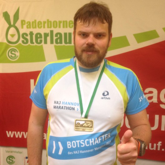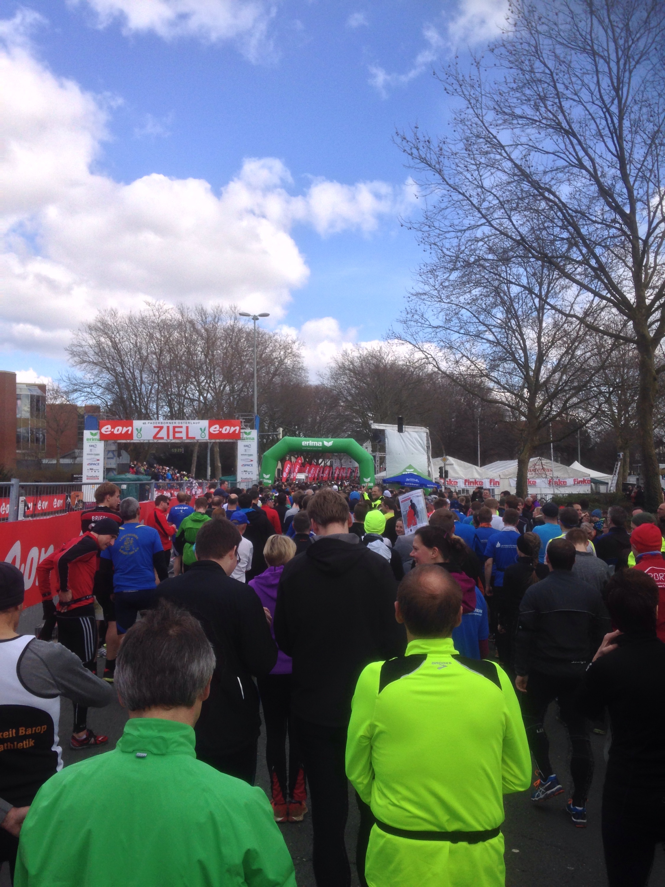 Zusammen mit Torben Buls (THE RUNNERS) machte ich mich also per Bimmelbahn auf nach Ostwestfalen. Die Startnummernausgabe war in der Maspernhalle, in der sonst die Paderborn Baskets Zweitligabasketball spielen. Hier ging es durch die Masse an Leuten recht chaotisch zu. Zum Glück mussten wir nicht nachmelden und ersparten uns dadurch eine längere Warterei. Nach der Gepäckaufgabe im Kleiderdepot, was in einer anderen Halle war, begaben wir uns in den Startblock.