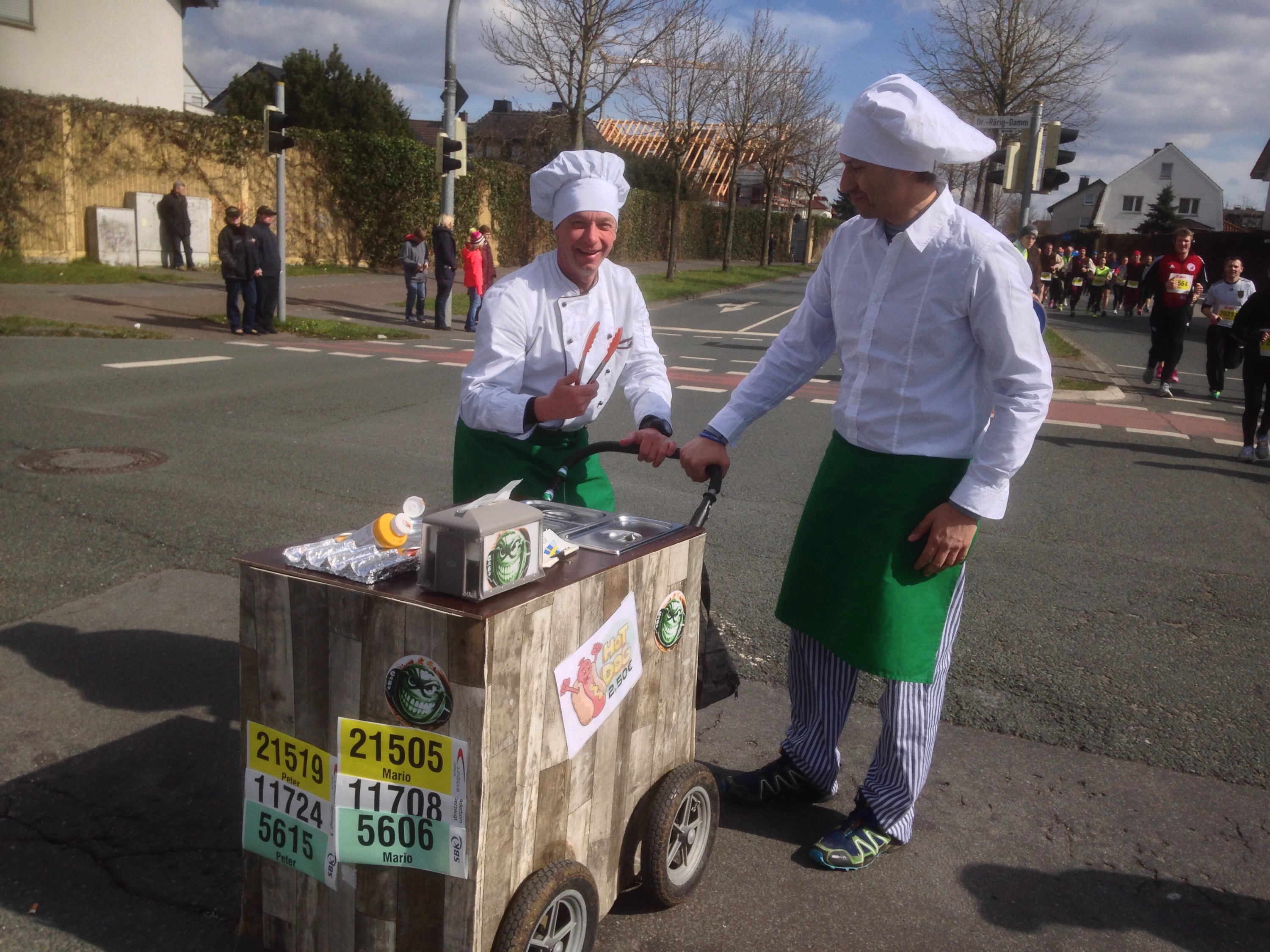 Der von Wolf-Dieter Poschmann moderierte Start erfolgte pünktlich. Im Startbereich herrschte eine super Stimmung. Aber wirklich schlecht wurde sie nie. Fast überall standen welche, die einen persönlich anfeuerten, höchst motivierte Streckenposten, Partys gab es an jeder Ecke und auch sehr viel Musik. Sambabands, Gitarrenklänge, Spielmannszüge… Wer da noch mit Kopfhörern lief, dem entging Einiges. Und auch sonst gab es viel spaßiges unterwegs. Peter und Mario verkauften von der Strecke aus Hotdogs. Das ganze übrigens im dritten Rennen heute. Den Fünfer und den Zehner hatten sie auch schon erfolgreich bewältigt. Leider hatte ich mein Geld im Kleiderdepot deponiert. So mussten wir also ohne Snack weiter.