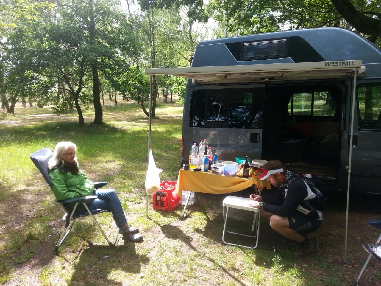 Der VP war ein Wohnmobil bei Oberhaverbeck. Dort gab es alles, was das Läuferherz begehrte. Und noch viel mehr. Wir nahmen einen kleinen Snack zu uns und zogen weiter. Es folgten schöne Abschnitte durch Wald und Flur. Am Totengrund konnten wir erstmals die schöne Aussicht über längere Entfernung bewundern. Wir konnten von hier in der Ferne sogar den Snowdome Bispingen erkennen.