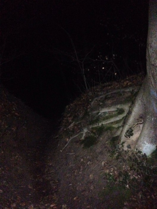 Ich lief über eine Wiese und dann wieder in den Sackwald. Nach einer Weile fand ich mich auf der Strecke des Schneewittchen Trails wieder. Nur lief ich entgegen der damaligen Laufrichtung. Des Öfteren hatte ich das Gefühl von den Stirnlampen eingeholt zu werden. Letztendlich war es aber immer der Mond, der jetzt sehr hell leuchtete.
